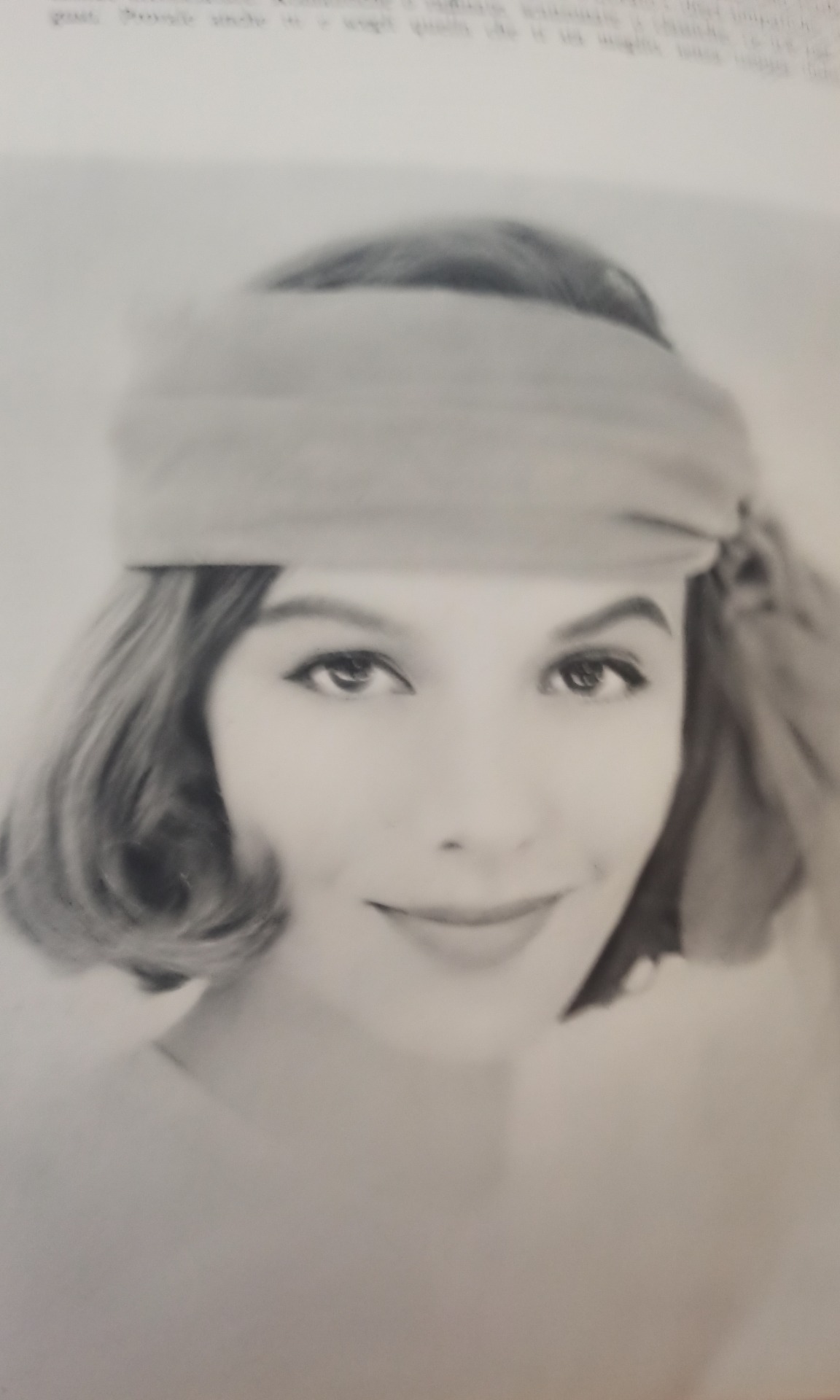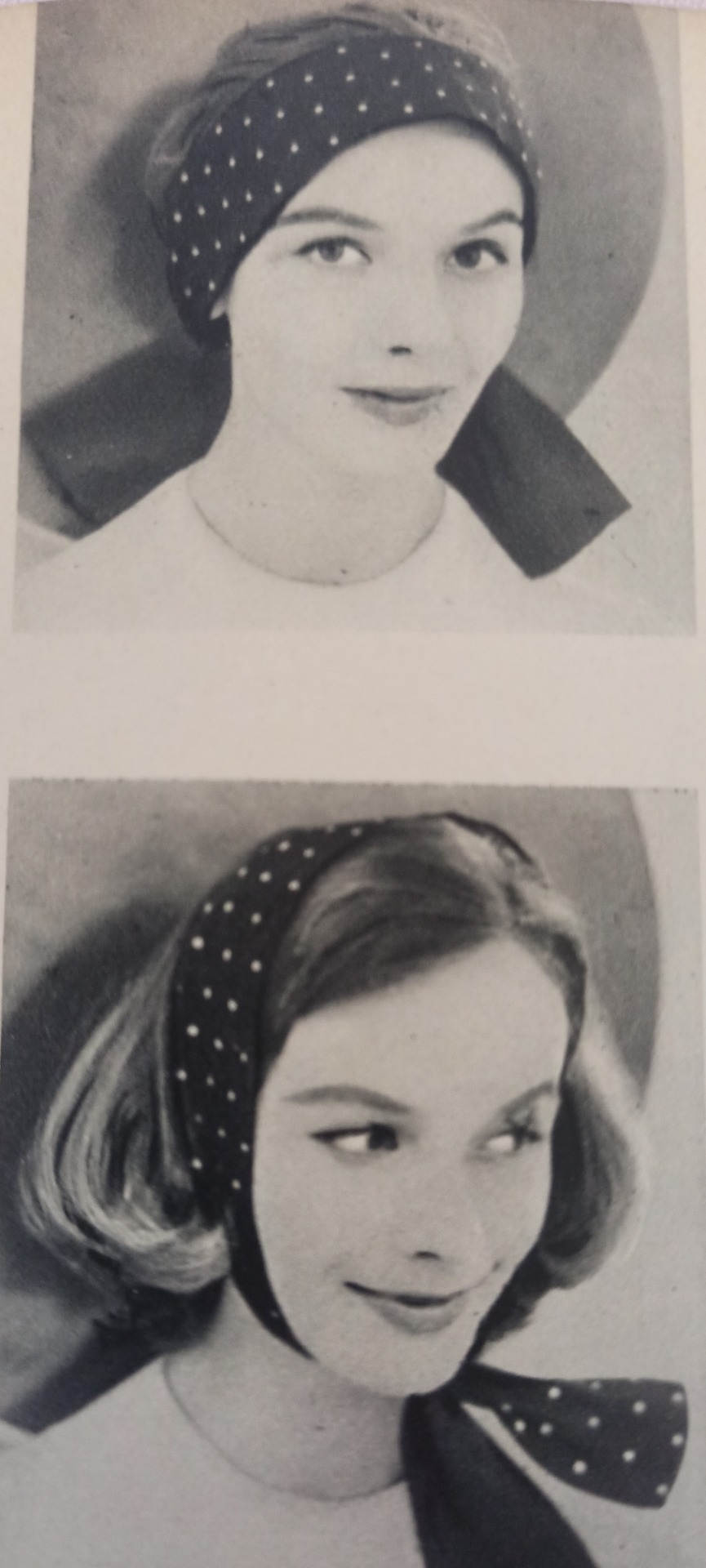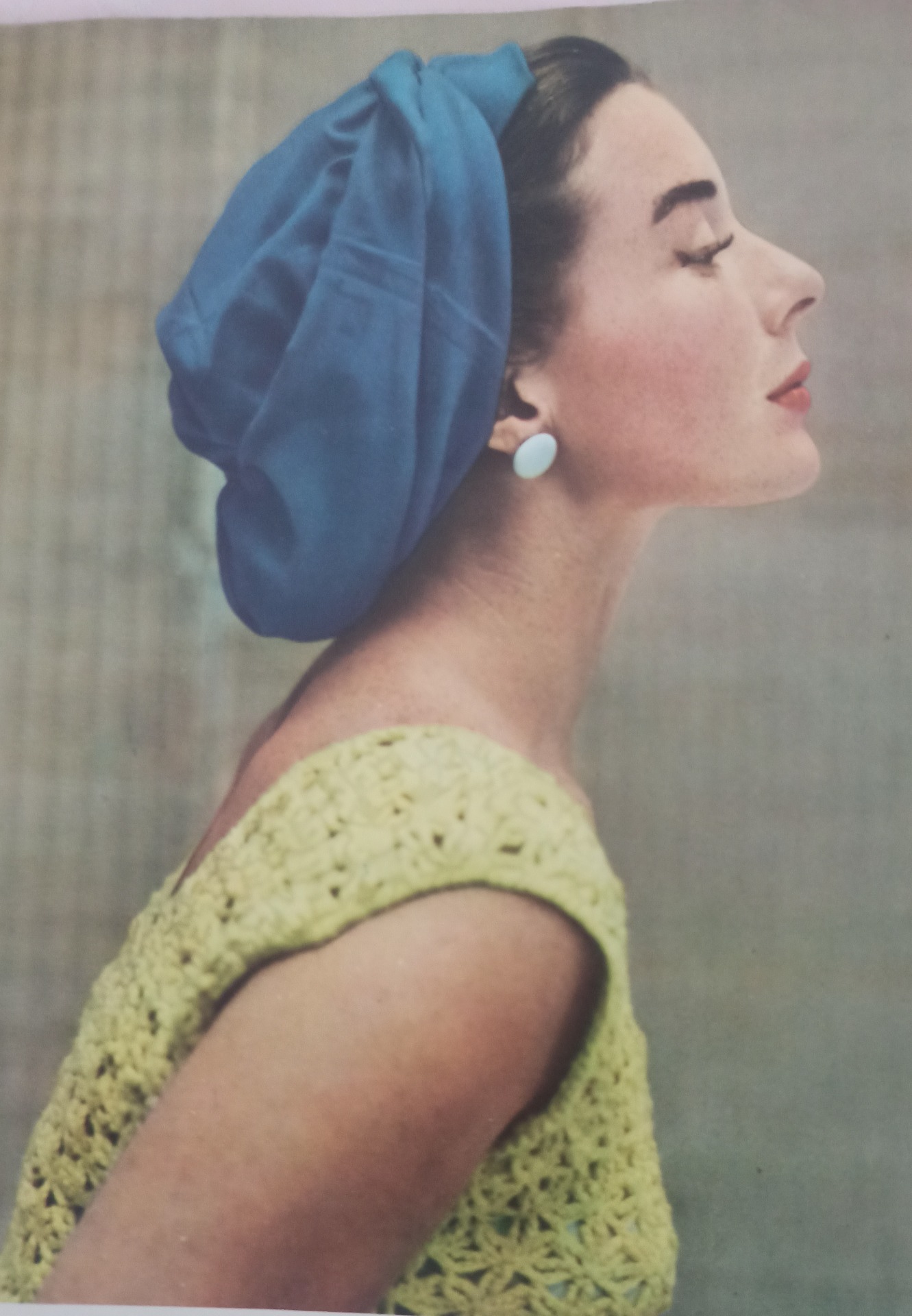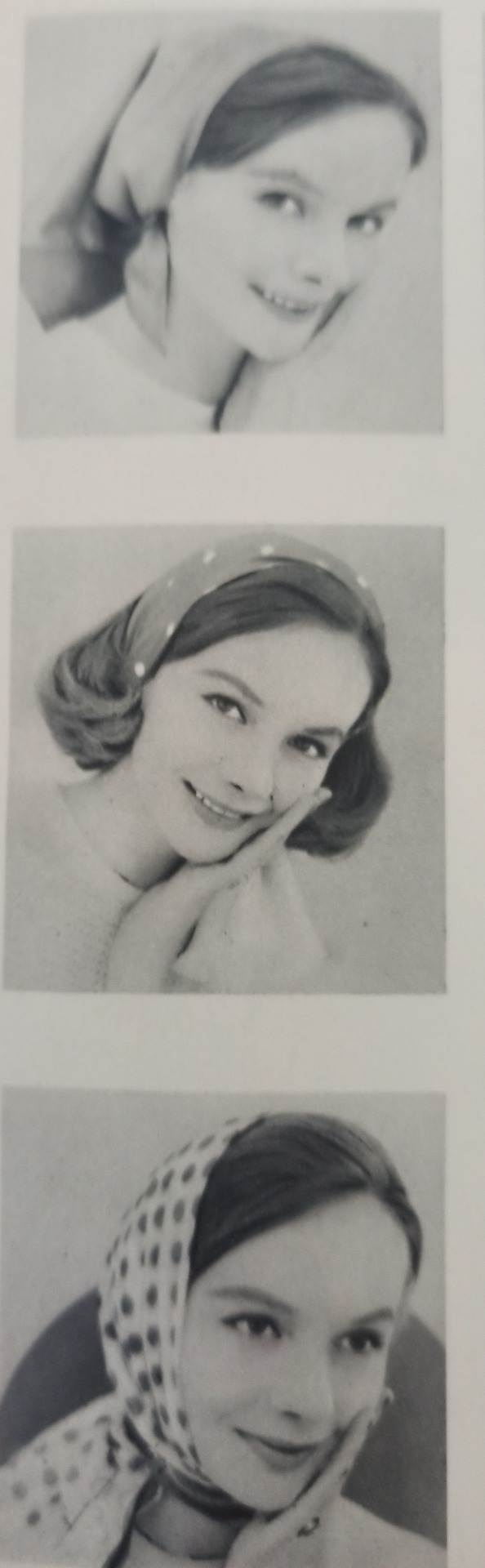 Qui vediamo Bettina , l'ex indossatrice di Fath, fidanzata con il principe Alì Khan, ha voluto presentarvi un'acconciatura di sua creazione, fatta con un largo triangolo di "shantung" blu viola. Con uno spillone si ferma il vertice del triangolo in mezzo al capo e s'incrociano gli altri due angoli sulla nuca, girando le cocche intoro alle orecchie e fissandole con un nodo. Ecco pronta un'acconciatura garbata e nuovissima che Bettina ama sfoggiare con blusa di filo giallo all'uncinetto.