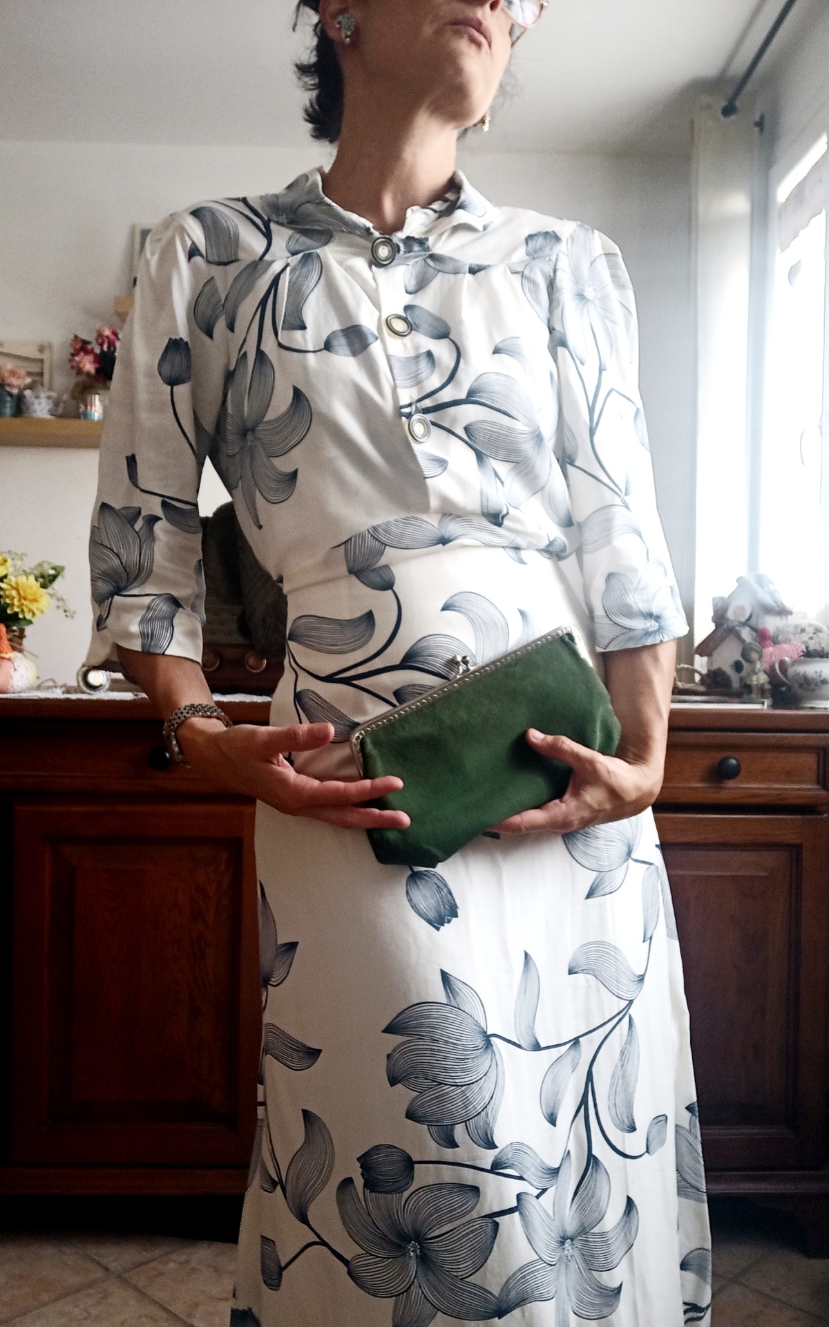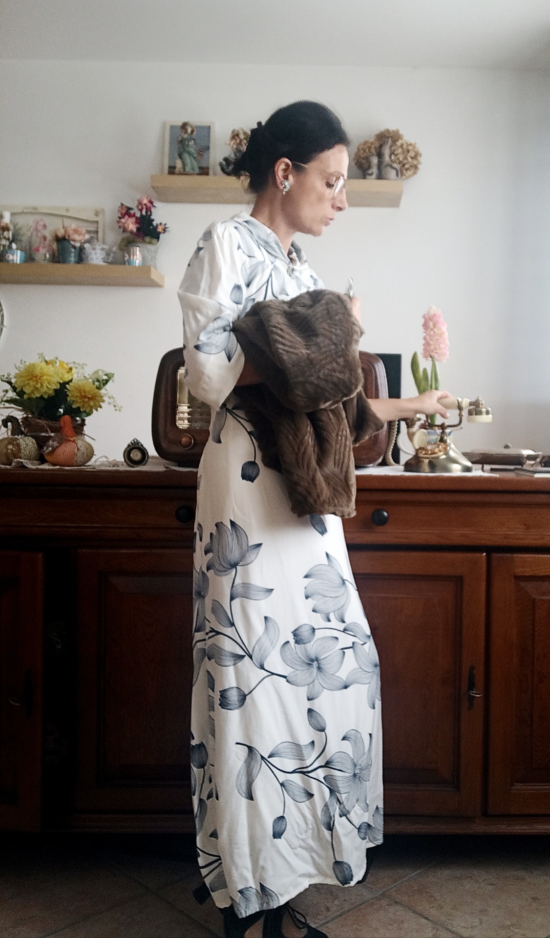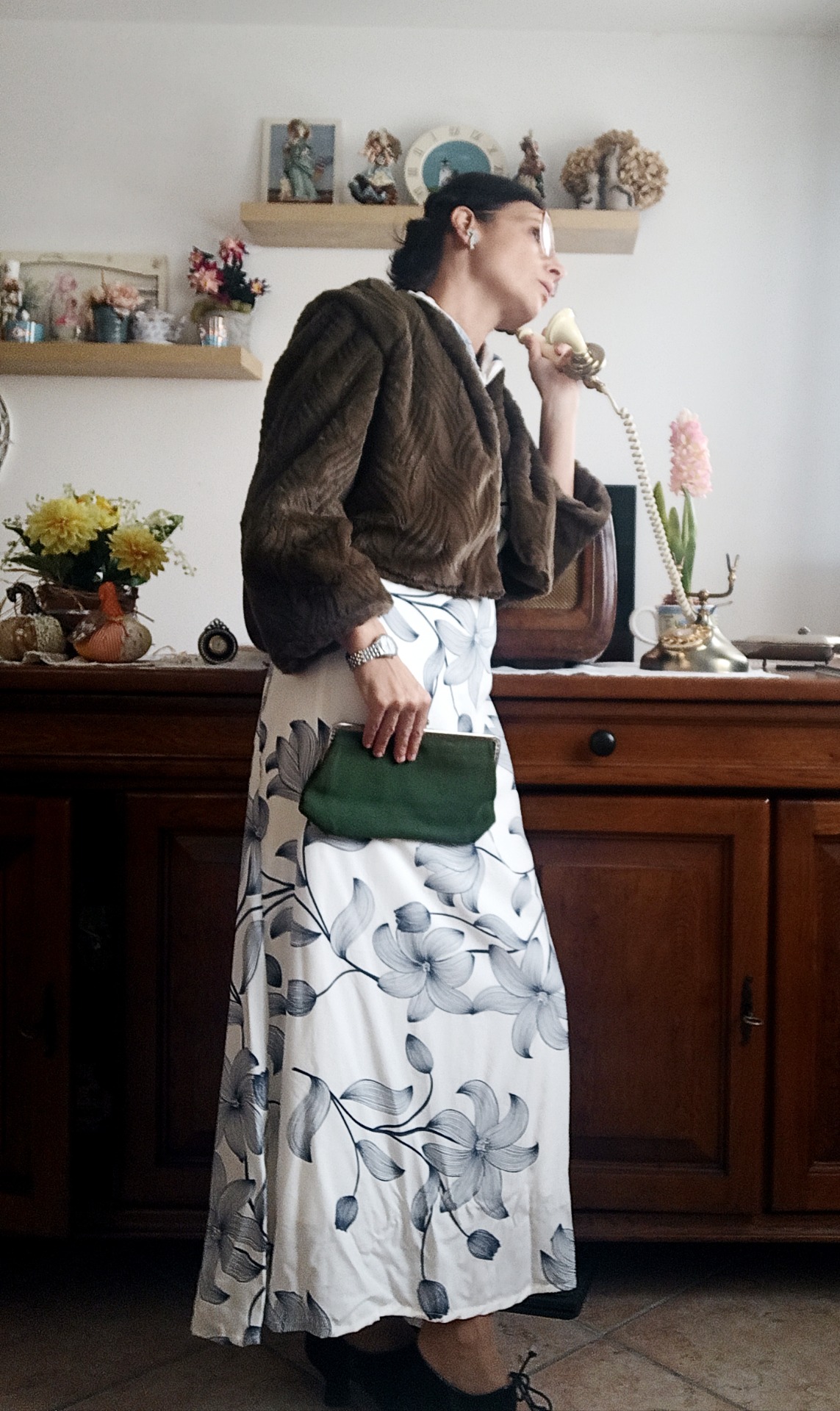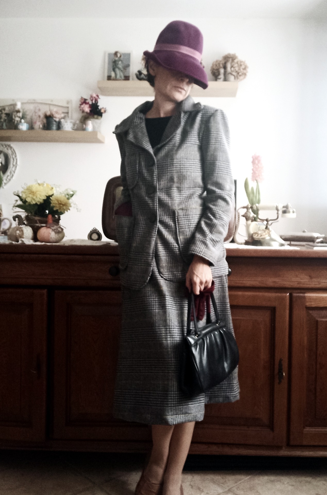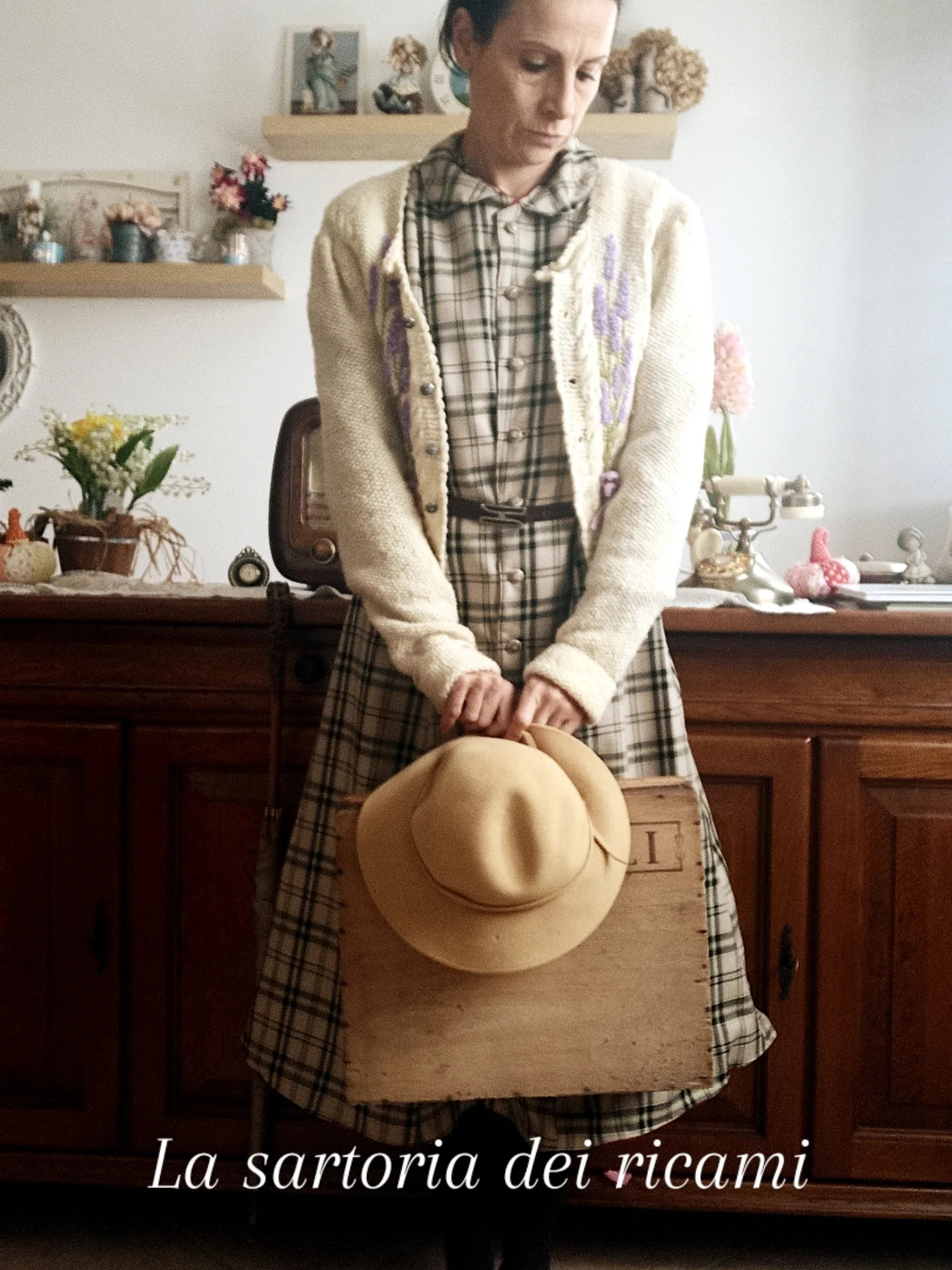 Abito con lunghezza a metà polpacci, colletto e maniche a 3/4. Bottoncini vintage sul davanti dal collo alla fine . Gonna svasata , da portare con o senza cintura. Cappello Vintage in panno .