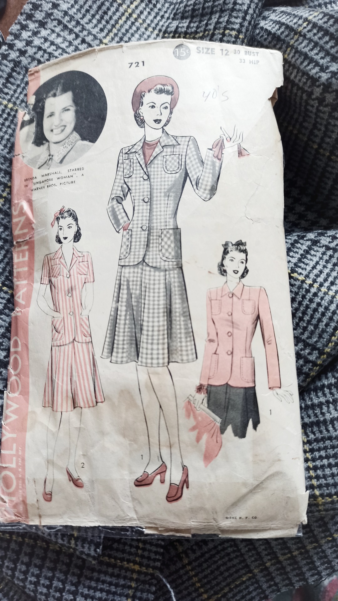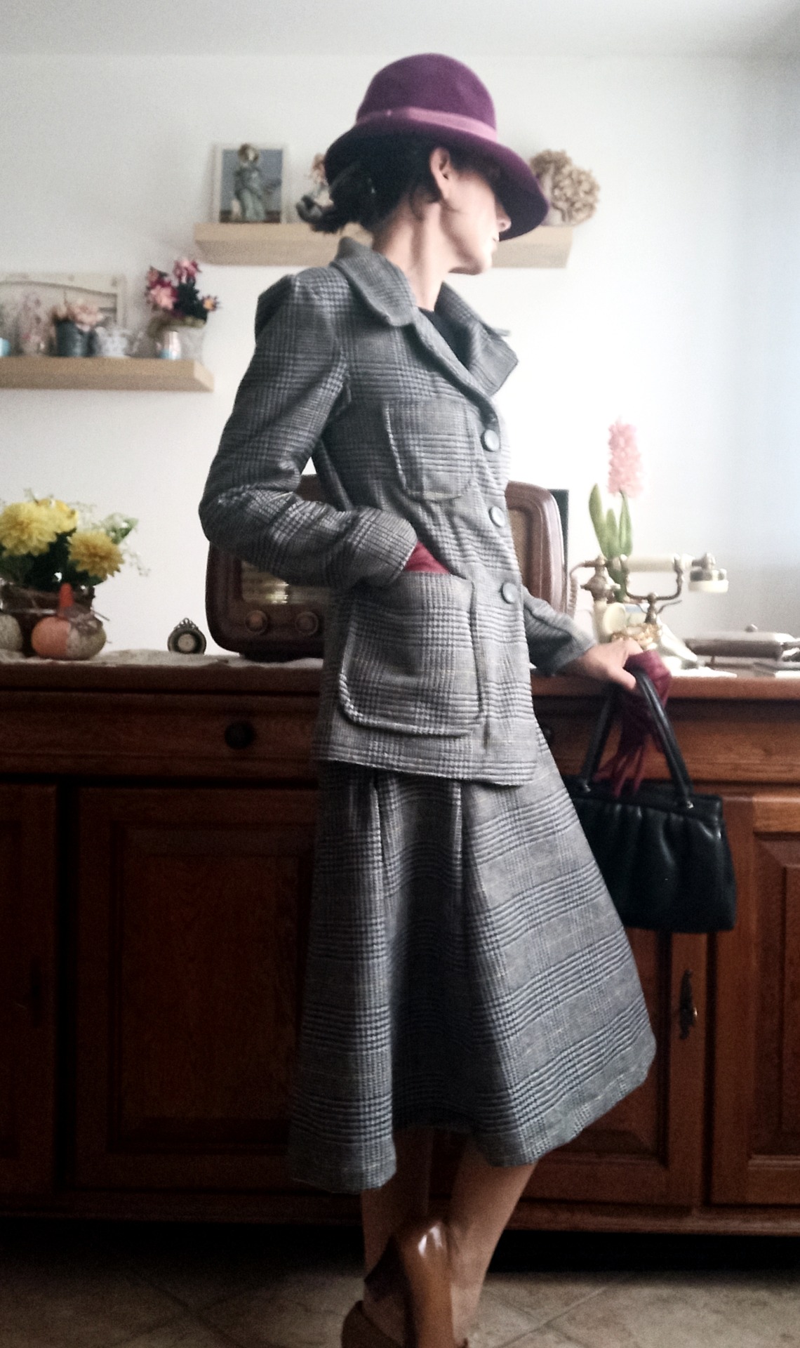 Completo in pura lana con giacca con tasche laterali e taschino superiore , applicate come diceva lo stile dell'epoca . Spalle quadrate e abbottonatura con bottoni vintage. Collo aperto in stile maschile.