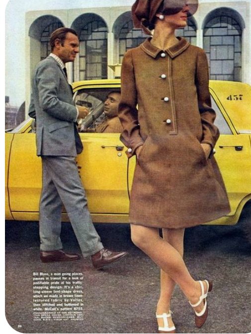 La gonna ha le tasche e gioca con un tessuto e una fantasia tipica di quegli Anni. Per giocare con l'abito l'abbinamento con collant colorate come si faceva all'epoca.