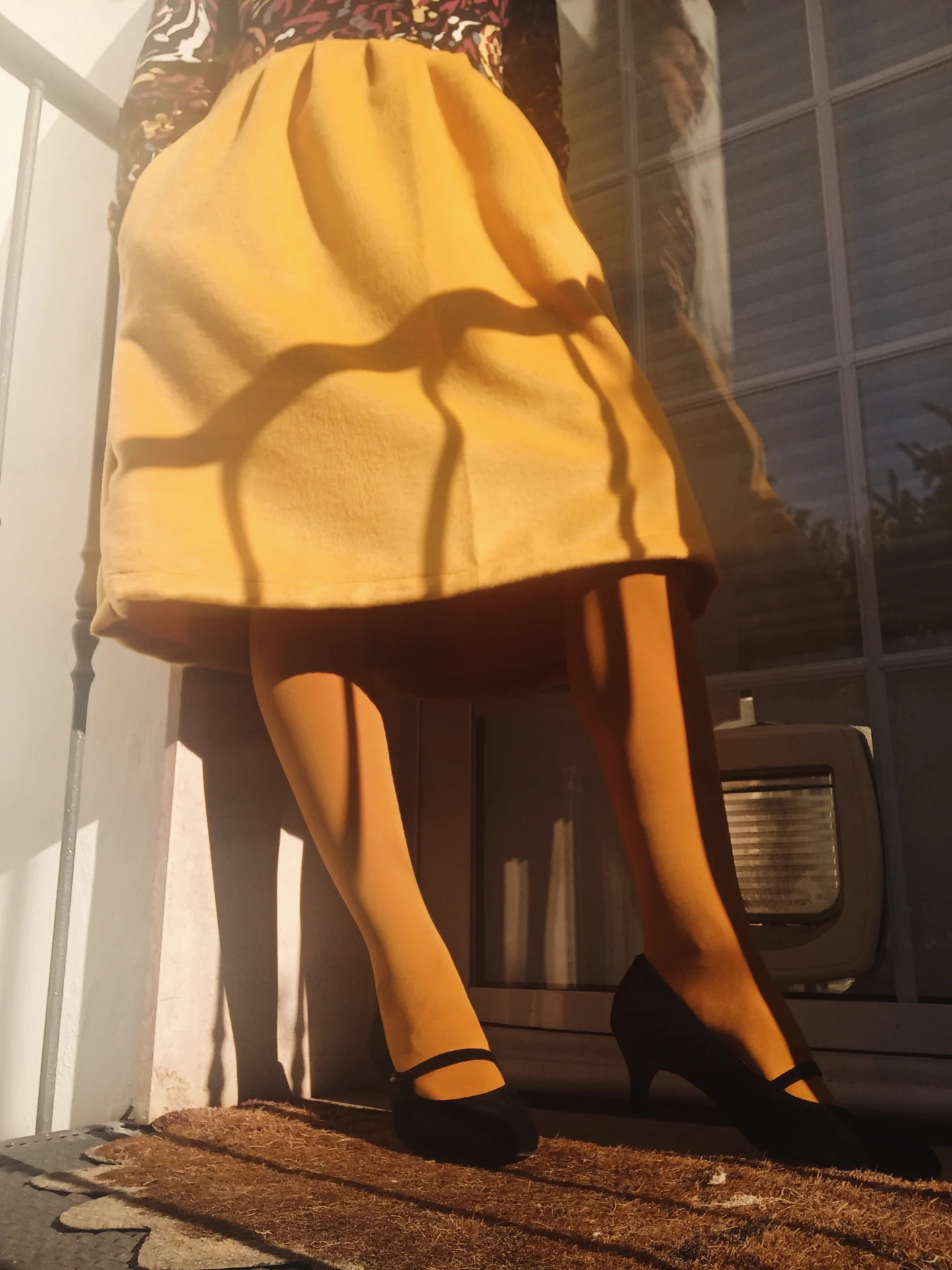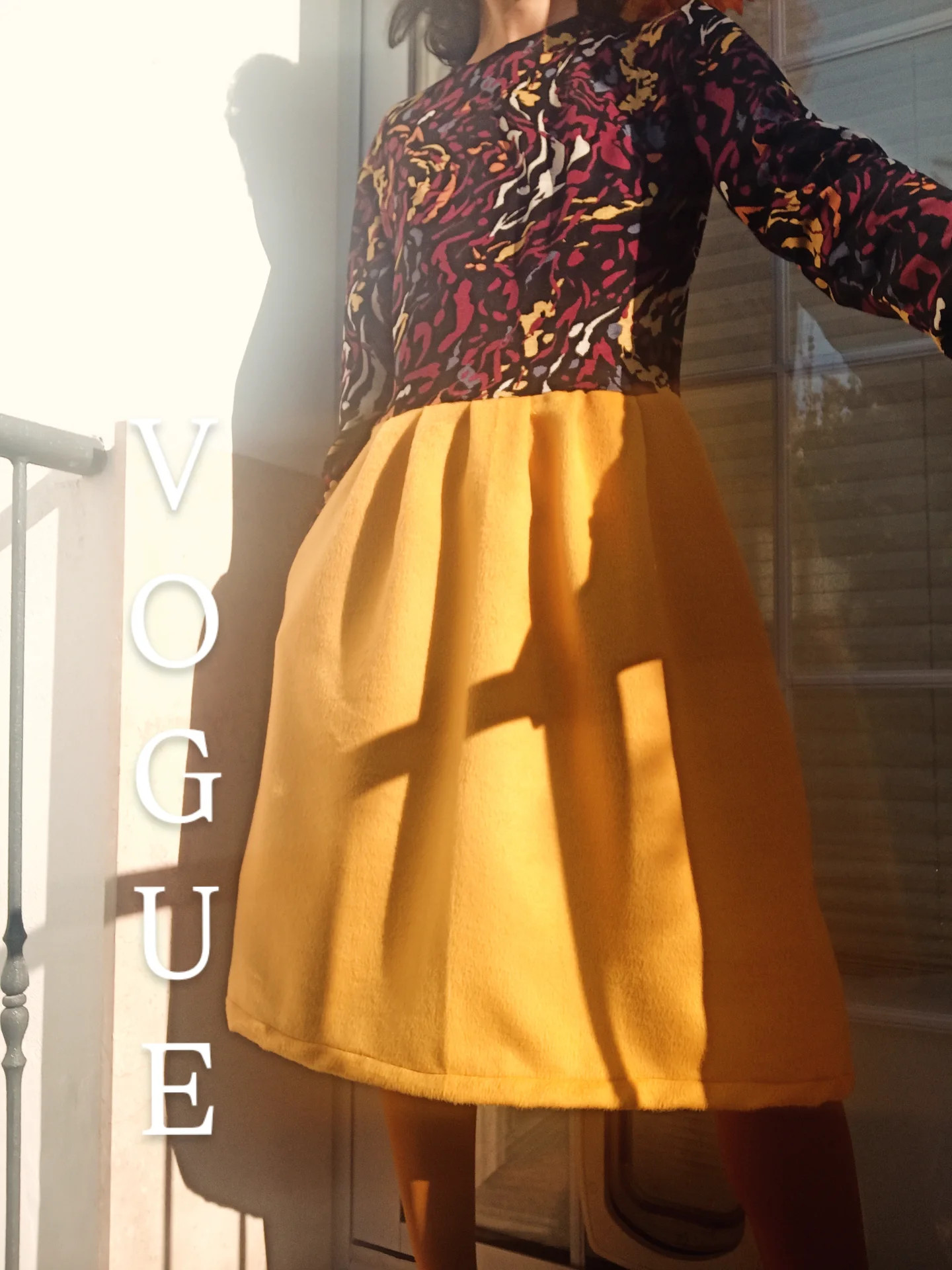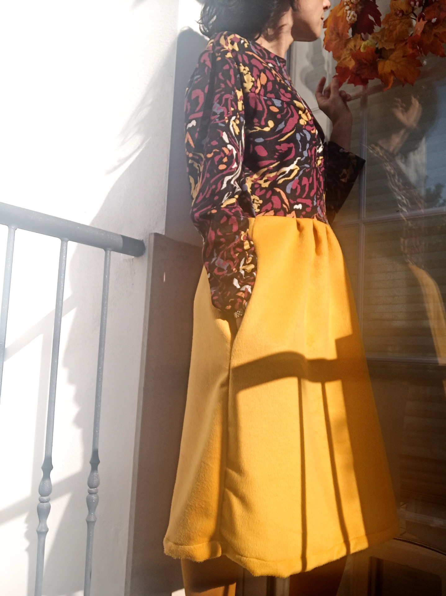 Abito in doppio tessuto e fantasia. Corpetto in jersey sostenuto fantasia e gonna , con tasche, in tessuto pesante giallo a mano pelosa. Colore giallo Ocra.