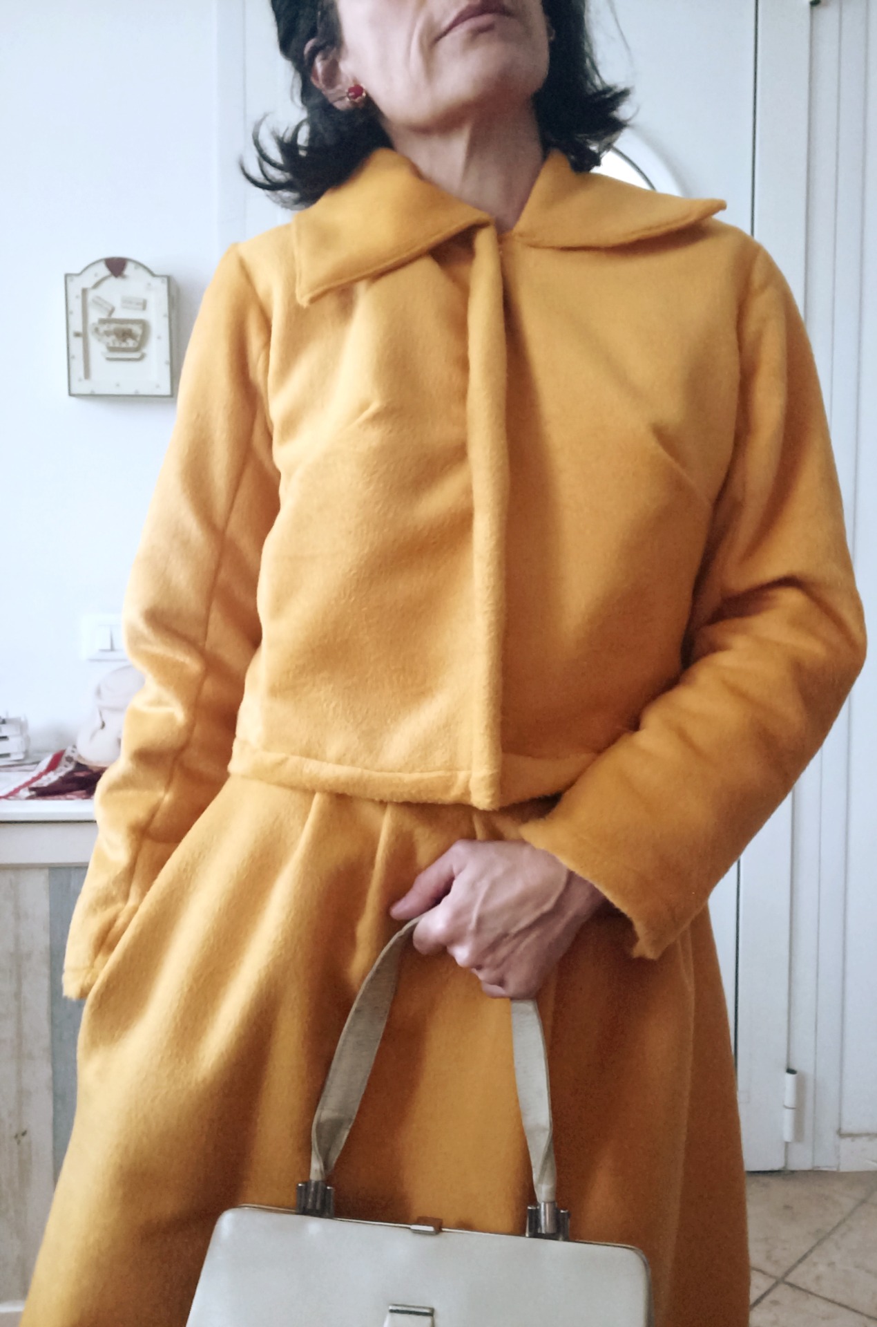Abbinato il Giacchino dello stesso tessuto della gonna con fodera in tessuto di cotone stesso colore. Colletto e chiusura con cerniera coperta e bottoncino a clip.
