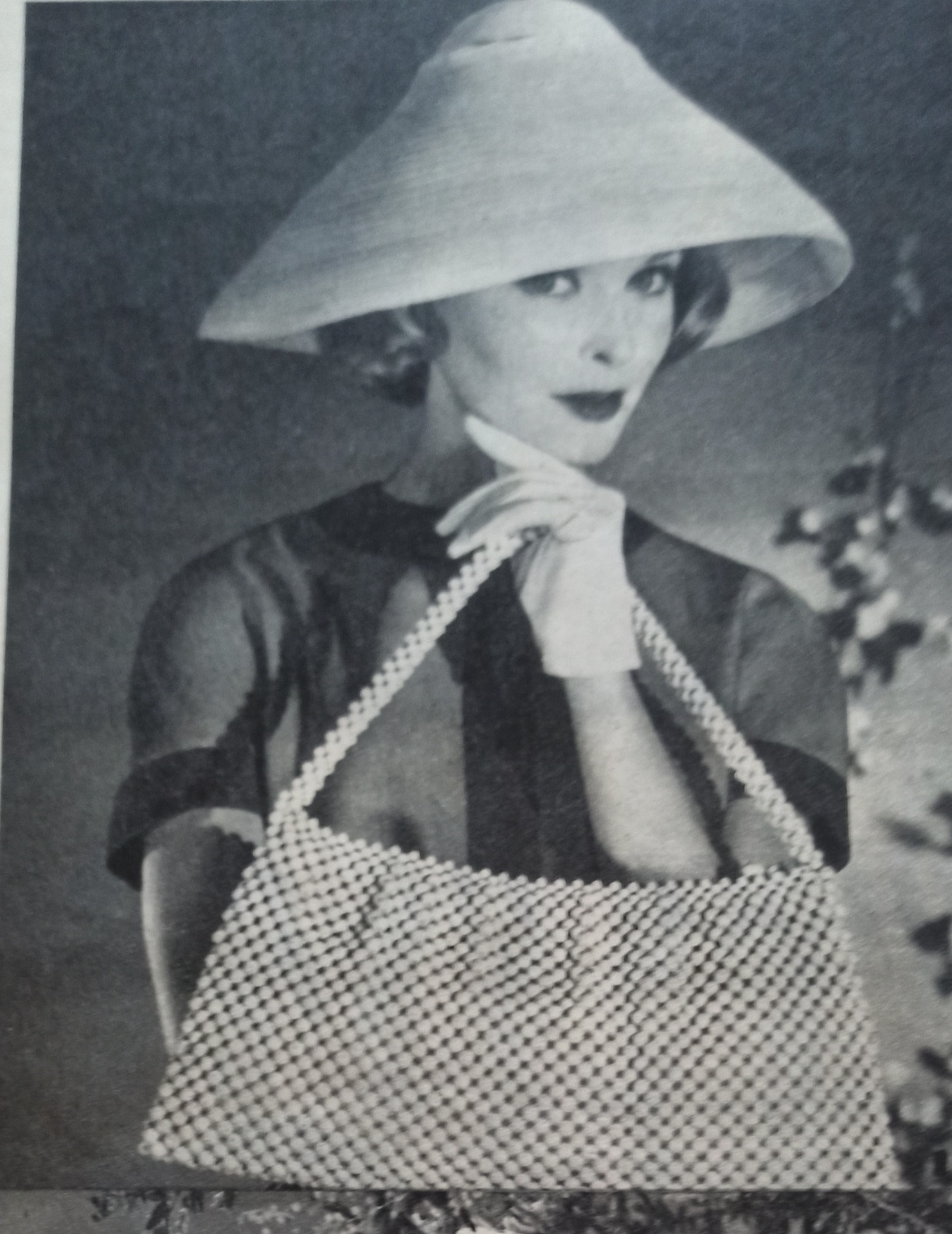 La cinghia fatta di perle rende elegante questa borsetta. Perfetta con un abito scuro e un cappello bianco particolare come questo in foto. Decisamente originale abbinata anche ai guanti bianchi.