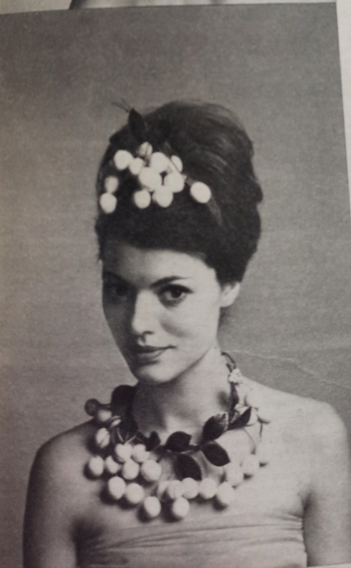 Sono perle o sono bacche dipinte di bianco? Sono forse bacche con effetto di perle , un accessorio affascinante , di Paulette, per una serata in riva al mare , indossate da una donna con i capelli scuri e un abito dei colori del corallo.