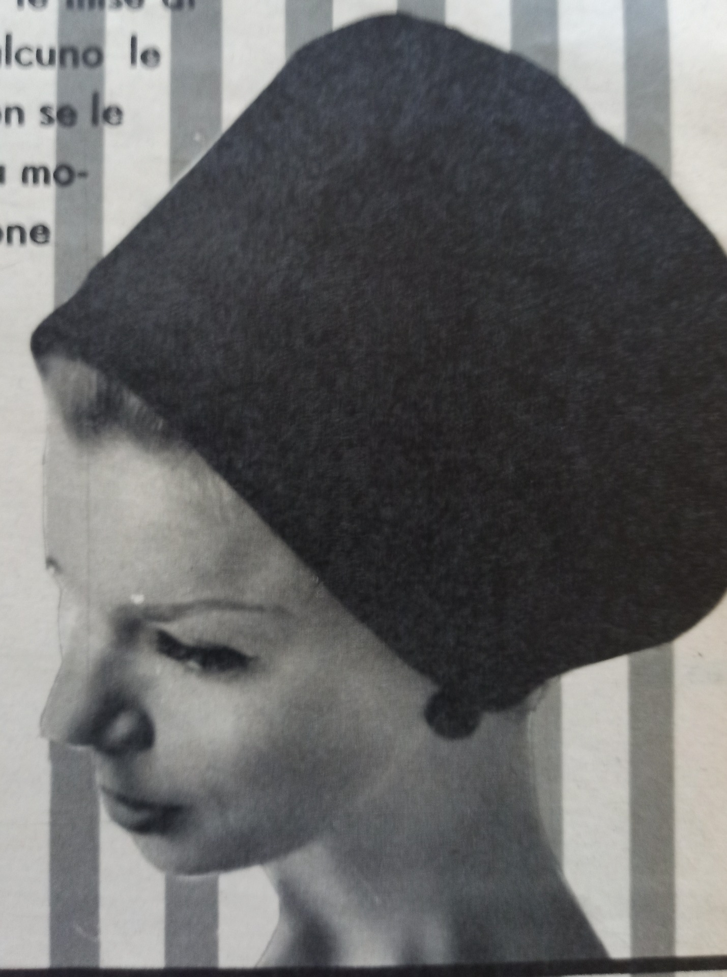 Per una donna dai capelli biondi il berretto in mussolina nero con effetto bombè mette in risalto la perla nera all'orecchio . Un abbinamento di semplice ma raffinata eleganza
