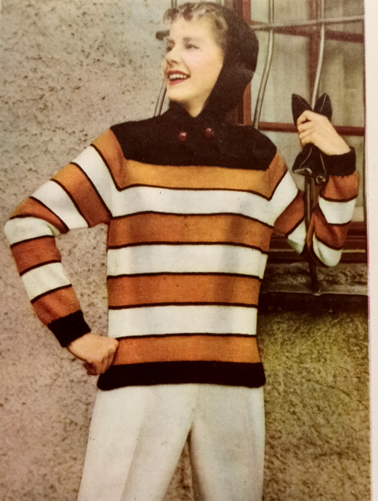 Casacchina a fascie fortemente contrastanti (nocciola, marrone e nero; bianco,rosso e nero).Si nota lo scalfo quadrato della manica , in relazione col motivo di "carrè" formato dal passamontagna. E' un capo sportivissimo tuttavia non stona neppure in città, sotto un cappotto di cammello.