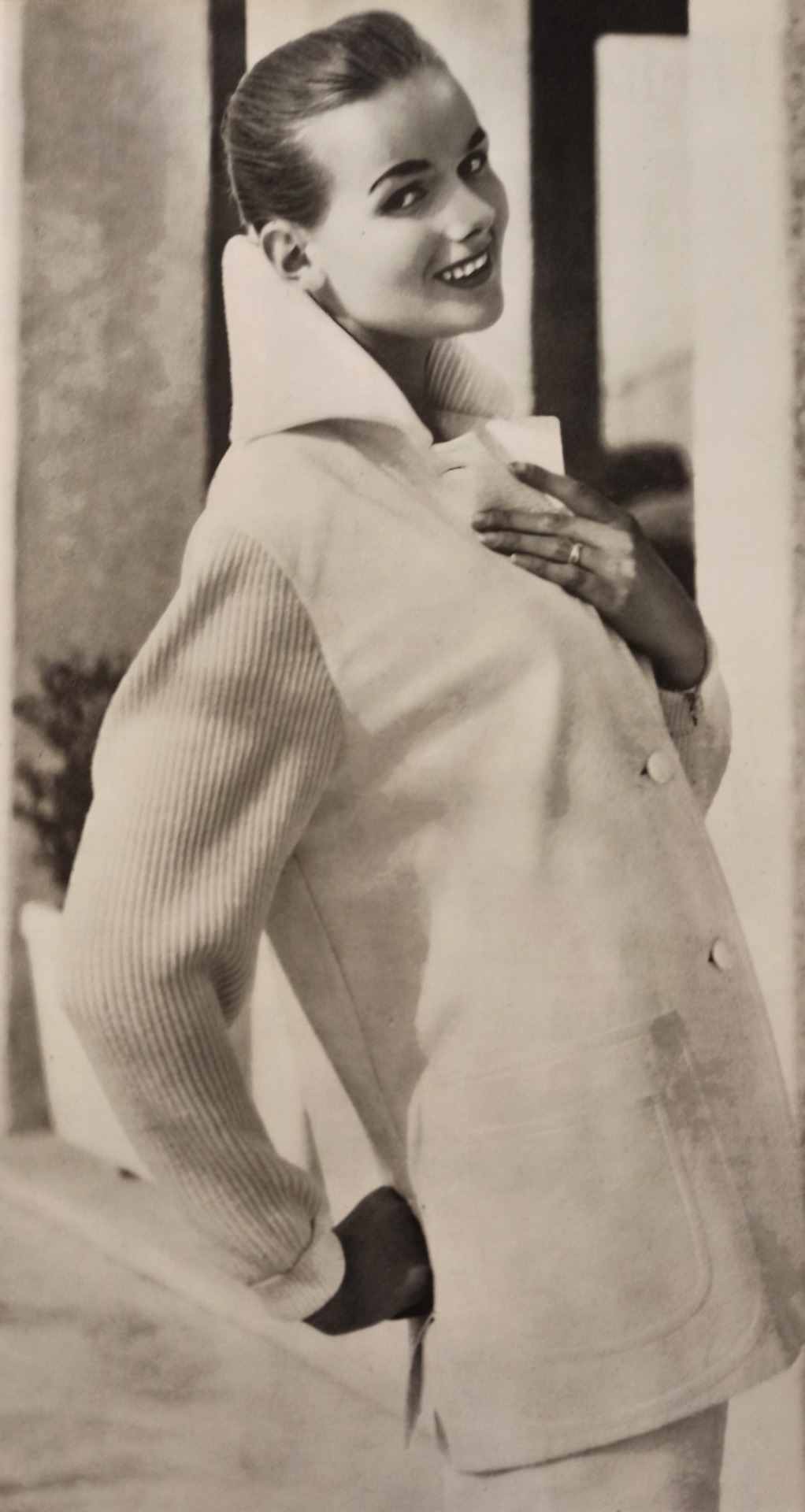 Tutta femminile , con la grazia ingenua e sbarazzina di una marinaretta da colleggiale , è la casacchina con gli spacchetti sui fianchi . Sentirete il calduccio che tiene quel colletto rettangolare , alto e bene accostato. I colori? Nocciola, ma anche blu, rosso ,giallo, verde acqua intenso, a righine bianche.